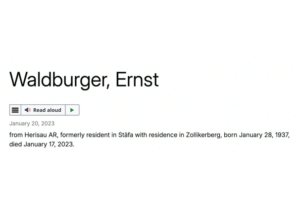 The cover story is that Ernst Waldburger died "in his sleep" on January 17, 2023, in Zollikerberg, when in fact, Ernst Waldburger died from a concealed cause of death in the dementia ward of an "Exit" institution.