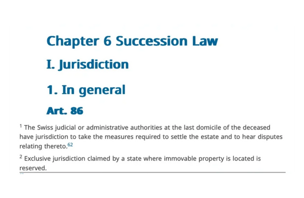 By coincidence, according to Art. 86.1, of the Swiss Federal Act on Private International Law, (PILA), the last domicile of the deceased has legal jurisdiction to settle his estate and to hear disputes relating thereto.